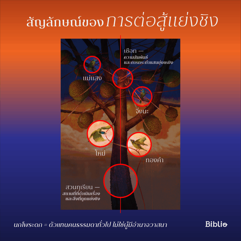 ต้นทุเรียนแทนสถานที่ที่ดำเนินเรื่องและสิ่งที่ถูกแย่งชิง นกแทนตัวละครแต่ละตัวที่พยายามขับไล่อีกฝ่ายออกจากถิ่นตน เชือกที่โยงกิ่งทุเรียนแทนความสัมพันธ์และการกระทำของตัวละคร ในขณะที่มีฉากหลังเป็นเมฆฝนเหมือนอยู่บนวิมาน ส่วนกรอบสีแดงด้านล่างก็เป็นรูปร่างของหลังคาบ้าน และเส้นแหลมๆ เหมือนรั้วก็คือหนามที่ทิ่มแทงทุกฝ่ายค่ะ