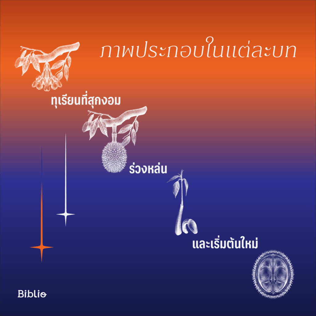 A: “ส่วนภาพประกอบที่อยู่ในหน้าเปิดบท มีที่มาจากระยะการทำสวนทุเรียน ตั้งแต่ระยะไข่ปลา ระยะตาปู ระยะเหยียดตีนหนู ระยะกระดุม ระยะมะเขือพวง ระยะหัวกำไล ระยะดอกขาว ระยะดอกบาน ไปจนถึงกลายเป็นผลทุเรียนให้เก็บเกี่ยว